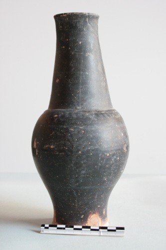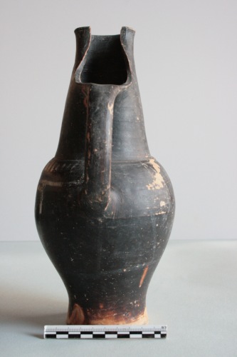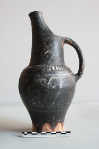 Oinochoe etrusca con bocca a cartoccio in argilla beige chiara e con vernice nera opaca con decorazione sovrapposta in bianco-crema. Sul collo, ai lati dell'ansa, motivo a girale e foglie; al centro, tracce appena leggibili di motivo vegetale. Sulle spalle, fascia a trattini verticali. Sul corpo, ai lati dell'attacco inferiore dell'ansa, motivo a girali; al centro sulla fronte, tracce di un ramoscello verticale a spina di pesce. Sopra e sotto la fascia decorata, due sottili righe bianche. La verniciatura è irregolare sul piede e lascia delle macchie a risparmio. E' a risparmio anche il fondo. La decorazione a colore sovrapposto è quasi totalmente scomparsa e in gran parte ormai illeggibile. Sono presenti diffuse incrostazioni e abrasioni superficiali. Anche se la decorazione di questo vaso è in gran parte scomparsa, il motivo floreale e le macchie sul piede sono caratteristiche del cosiddetto gruppo del Fantasma, la cui produzione è stata collocata in ambiente ceretano.