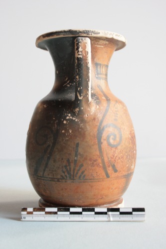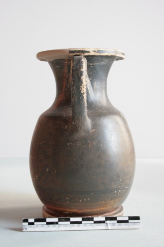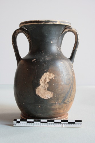 Pelike etrusca a decorazione sovrapposta in argilla giallina e vernice nera opaca, in più punti rossa per difetto di cottura. Il vaso è composto da: orlo rovesciato all'esterno, anse a nastro, piede ad anello con due scanalature orizzontali. Decorazione in rosso-vino sovrapposto: sul collo trattini verticali tra due linee orizzontali, sul corpo sotto le anse piccole palmette e ai lati motivo a girali e foglie; sui lati a)e b) figure ammantate volte a sinistra con particolari dei panneggi incisi; al di sotto della zona decorata vi sono sottili linee orizzontali. Il fondo è risparmiato e il colore sovrapposto è scomparso quasi del tutto, lasciando al suo posto la traccia scura a silhoutte delle figure e dei motivi decorativi. E' mancante di parte dell'orlo e vi sono delle profonde abrasioni che rendono illeggibile la decorazione di uno dei due lati. la pelike rientra nel gruppo del Fantasma.