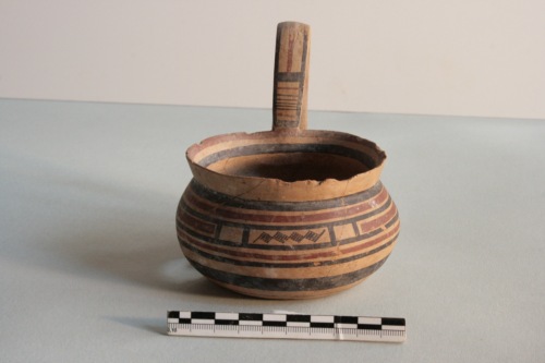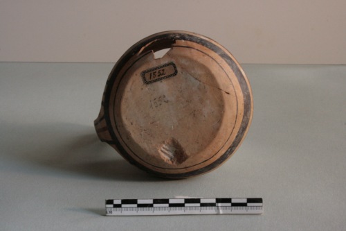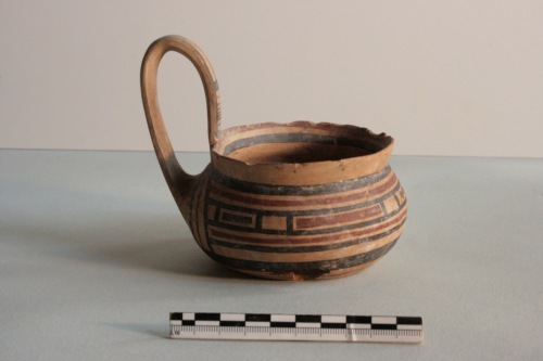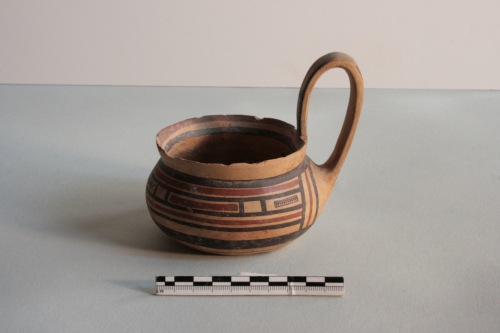 Boccale geometrico daunio a decorazione bicroma in argilla crema molto ben depurata e decorazione in bruno e rosso-bruno. L'orlo è dritto, l'ansa sopraelevata, il corpo emisferico ed è privo di piede. E' decorato all'interno dell'orlo da una doppia fascia rossa e bruna, sull'ansa da trattini orizzontali sull'attacco superiore e verticali sul resto, sul corpo da motivi a fasce alternate rosse e brune, al centro da un motivo a rombi con reticolo, uniti per un vertice e, ai lati, rettangoli riempiti pure a reticolo. Fasce brune e rosse intorno all'attacco inferiore dell'ansa. Restaurata da più frammenti e mancante di un frammento sul fondo.