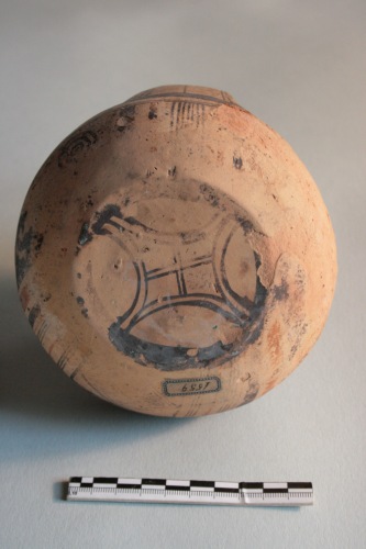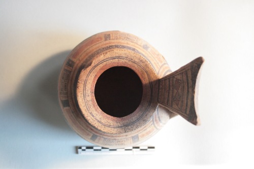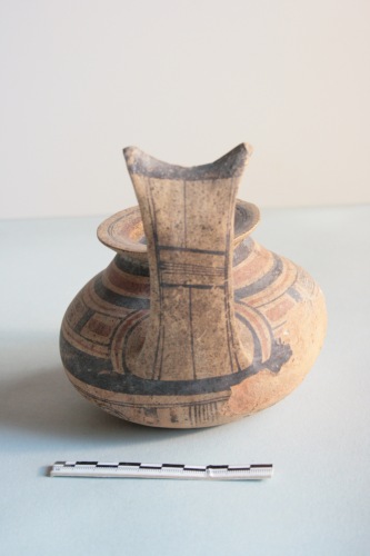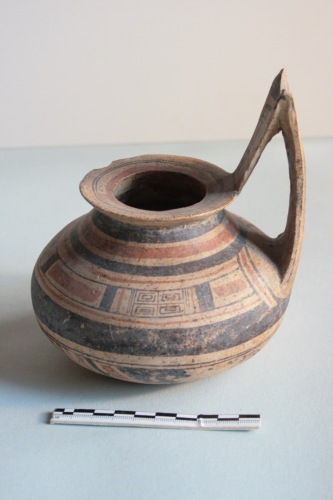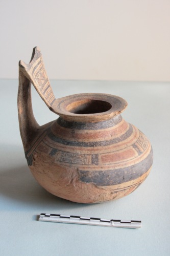 Brocca geometrica daunia a decorazione bicroma in argilla giallo-crema porosa e impura con superficie giallo-arancio. L'ansa è a gomito con sella pronunciata, l'imboccatura ad ampio orlo, il corpo emisferico schiacciato ai poli. Il vaso è apode. Decorazione in bruno e rosso mattone: il collo è decorato a fasce alternate rosse e brune; sul corpo motivo a riquadri iscritti, che si ripete per tre volte alternato a larghe fasce orizzontali rosse; ampia fascia bruna lungo il punto di massima espansione; nella parte inferiore al centro motivo a rombo con quadrati iscritti, inquadrato da fasci di linee diagonali rosse e brune, ai lati due motivi a cerchi concentrici; sotto l'ansa fascio di linee verticali rosse e brune; sul fondo motivo a doppio rombo con lati concavi e doppia croce iscritta circondato da fascia circolare bruna. La decorazione è resa in gran parte illeggibile da diffuse incrostazioni e sbrecciature. Sul fondo sono presenti resti di ossidazione di colore verde dovuto a contatti con metalli.