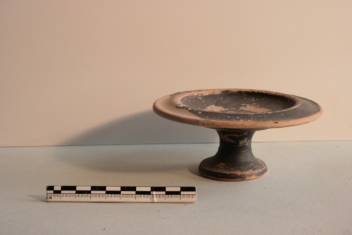 Piattino su piede a vernice nera opaca in argilla giallina. Il piattino è poco profondo e presenta un largo bordo concavo lievemente flesso verso il basso. Il profilo esterno a curva continua fino al breve bordino diritto del piede. Il fondo è leggermente cavo. A risparmio l'orlo del piede e la base d'appoggio. Sono presenti diffuse screpolature. Esemplari simili sono molto frequenti ad Adria tra il III e il II secolo a.C.