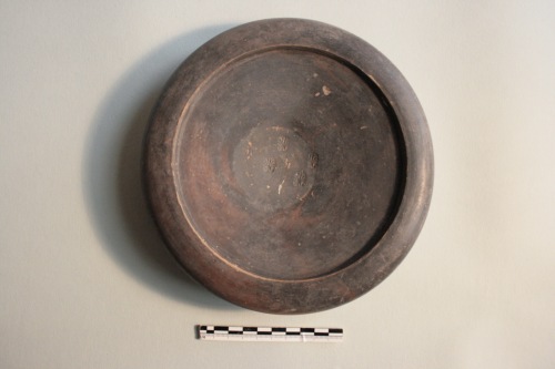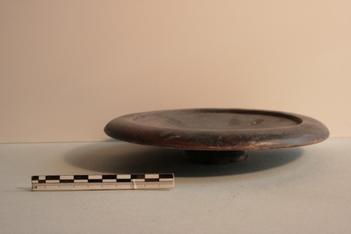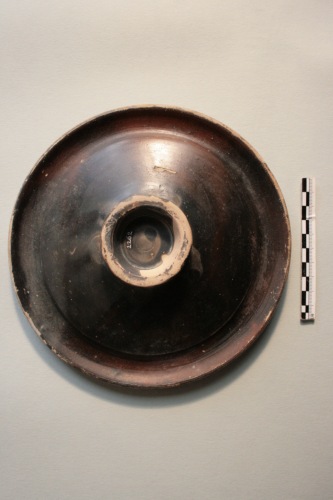 Piatto in argilla grigio chiara a vernice nera opaca in più punti rossa per difetto di cottura. Il piatto si presenta largo e poco profondo, a pareti rettilinee e profilo troncoconico con largo orlo arrotondato rivolto verso il basso, dopo un brusco innalzamento verticale all'interno della vasca, e con un piedino troncoconico cavo. Al centro del piatto vi sono quattro timbri a palmetta impressi irregolarmente a croce. La base d'appoggio è a risparmio. La vernice nera è in più punti screpolata. La forma del piatto sembra derivare dal tipico piatto da pesce attico. Questo esemplare ricorda tipi diffusi in ambiente padano.