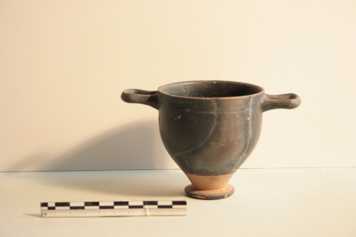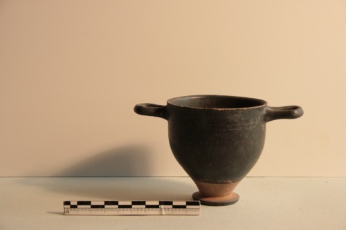 Skyphos in vernice nera in argilla pallida, con ingubbiatura grigiastra a macchie rosso vino e vernice nera opaca tendente al grigio scuro. Il vaso presenta il profilo delle pareti che si incurva sensibilmente verso il piede a disco aggettante, anse orizzontali a bastoncello impostate sotto l'orlo. La fascia sotto il piede e il fondo del piede sono risparmiati. Sulla fascia del piede a risparmio è presente una macchia a vernice nera "sbavata" dalla zona superiore. All'altezza delle anse vi sono due incisioni irregolari intorno al corpo, forse segni di un strumento. Sulla superficie vi sono incrostazioni e una piccola abrasione sotto un'ansa. Il vasetto presenta un profilo più fluido e meno angoloso di molti skyphoi del IV secolo a.C. a questo contemporanei.