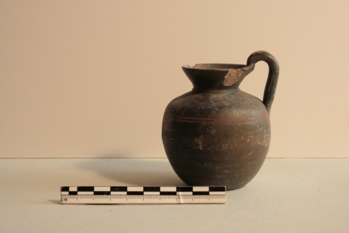 Piccola olpe a vernice nera in argilla grigiastra impura e vernice bruno scuro opaca con difetti di cottura. Uso del colore rosso paonazzo. L'olpe presenta una bocca rotonda ad imbuto ben distinta dalle spalle arrotondate; sulla strozzatura del collo vi sono due solchi incisi; l'ansa è a nastro ingrossato e sopraelevata; è priva di piede. All'altezza dell'attacco inferiore dell'ansa sono presenti due sottili righe orizzontali parallele in color rosso-paonazzo. La superficie è rovinata da molte incrostazioni e sull'orlo da sbrecciature. La brocca a bocca rotonda è distinta dal corpo e decorata con fasce a colore sovrapposto di tradizione ionica. La forma sembra essere stata imitata a lungo in Occidente. La piccola brocca manca di confronti precisi ma per qualità di argilla e di vernice sembrerebbe appartenere a una imprecisata fabbrica italiota del IV secolo a.C.