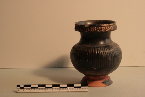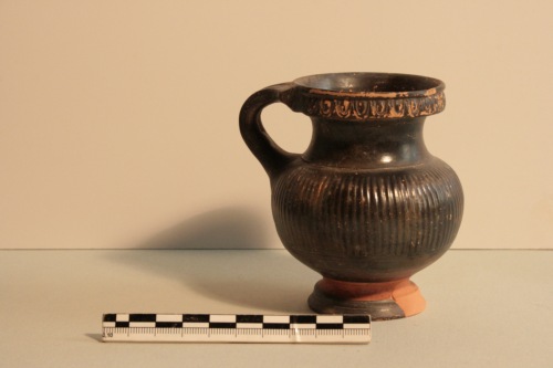 Piccola brocca strigilata a vernice nera in argilla beige rosato con ingubbiatura rosa violaceo e vernice nera a riflessi metallici. Il corpo del vaso è schiacciato, il collo è a gola accentuata separato dal corpo da un piccolo orlo, la bocca è rotonda con bordo rovesciato all'esterno, l'ansa è bifida alla sommità con due protuberanze laterali, il piede è troncoconico cavo con solco orizzontale a metà dell'altezza e con breve stelo a gola. Il collo del piede e il fondo sono a risparmio. Sull'orlo rovesciato vi sono una serie di ovuli impressi; invece sul corpo strigilature regolari; sotto l'attacco inferiore dell'ansa, un grande segno ad "x" impresso. E' mancante di un frammento del piede e la vernice nera è in più punti screpolata. Il vasetto risente ancora dell'influenza della produzione attica di vasi strigilati e con decorazione impressa che tanto favore ebbero in Occidente dove furono per lungo tempo imitati. Nonostante le modeste dimensioni, conserva infatti una certa eleganza nella sintassi decorativa degli ovuli sull'orlo e della sottile strigilatura che insieme alla lucentezza della vernice garantiscono un sicuro effetto armonioso.