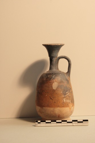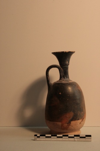 Lekythos a vernice nera di fabbrica campana in argilla giallo rosato e vernice nera opaca con difetti di cottura. Il vaso presenta corpo ovoidale con bocchino a tromba su alto collo distinto dalle spalle da una leggera modanatura; anse a nastro e piede a tondello. La zona inferiore del corpo e il piede, con molte "sbavature" di vernice nera, sono a risparmio. La superficie presenta screpolature diffuse. La forma è molto comune in Italia meridionale tra il IV e il III secolo a.C. Il vasetto di Torcello sembra appartenere a fabbrica campana in base a molti confronti simili.