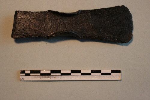 Ascia a brevi alette mediane in bronzo a fusione. La lama è a lati subparalleli, il taglio espanso e assottigliato (ora molto frastagliato), le alette mediane brevi, il tallone molto sviluppato con apici ripiegati. L'esemplare è ascrivibile ad una foggia largamente diffusa in un orizzonte di passaggio dalla media età del bronzo all'età del bronzo recente nell'area nord-alpina; nel Veneto nord-orientale e nel vicino Friuli. Per l'area veneta i confronti più pertinenti sono quelli dal Bellunese e dal Trevigiano. La superficie è caratterizzata da una patina verde scuro.