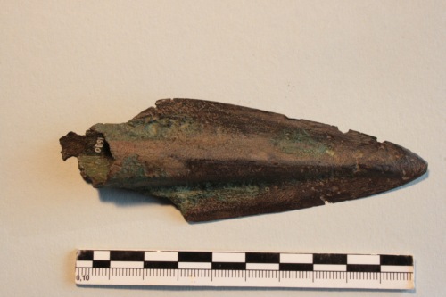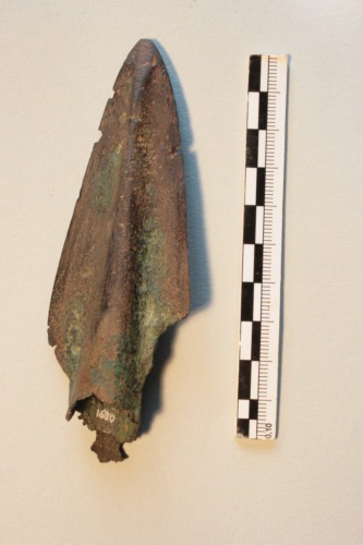Punta di lancia in bronzo con patina di colore scuro. Lama con innesto a cannone (rotta alla base delle alette; immanicatura frammentaria).