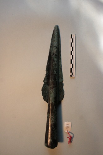 Grande punta di lancia in bronzo con patina verde scuro. La lama è grande e foliata, a base ovale con costolatura mediana (margini delle alette frastagliate nelle parti basali), immanicatura a cannone di lunghezza inferiore a quella della lama e a sezione poligonale con foro per il fermo. Callegari annota la presenza sulla cuspide di lettere runiche, fra un cerchietto e un arco, e sul rovescio a sinistra un grande arco con tre semicerchi alle estremità, a destra un triskele e una svastica, ambedue con tre stelline alla fine delle linee. Si tratta di una punta di lancia di grandi dimensioni che trova confronto con esemplari della prima età del ferro dall'Etruria. Particolarmente significativo il confronto con un esemplare rinvenuto nell'abitato di S. Basilio di Ariano Polesine.