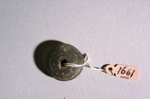 Perla color azzurro scuro di forma globulare schiacciata, databile genericamente all'età del ferro e di probabile provenienza dall'agro altinate.