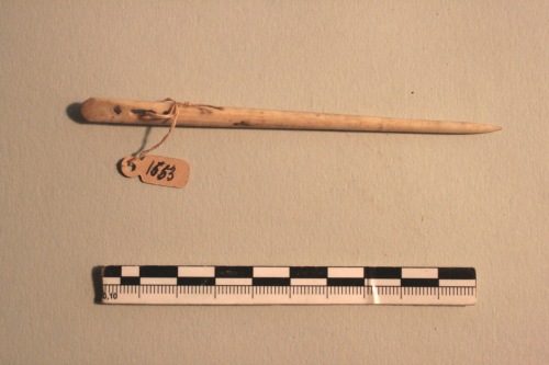 Ago in osso con cruna appiattita e vari fori rotondi o rettangolari. Si può ritenere pertinente a un corredo funerario femminile ed è datato genericamente all'età romana.