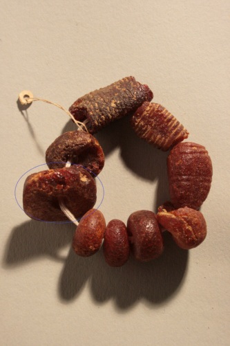 Perla in ambra colore rosso cupo, frammentaria, di forma oblunga, irregolare. Per la sua atipicità non è inquadrabile in una precisa fase cronologica dell'età del ferro.