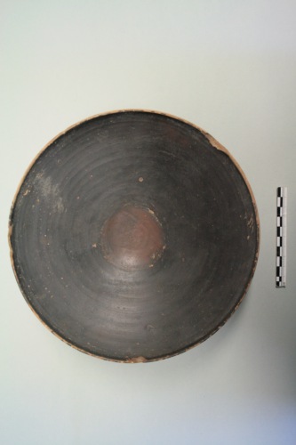 Piatto a vernice nera in argilla giallina sottile e polverosa e vernice nera opaca tendente al bruno con macchie rossastre di cottura. Il piatto è a vasca bassa e larga, il profilo delle pareti è nettamente troncoconico con orlo verticale e piedino ad anello con fondo umbilicato. Al centro della coppa è presente un cerchio rosso-bruno per sovrapposizione di un altro piatto durante la cottura. Sono visibili segni di strumento sulle pareti esterne. La base d'appoggio è a risparmio. Verso il piede vi sono sbavature di vernice. La vernice nera tende a sollevarsi ed è in più punti scomparsa. Il piatto è mancante di alcuni frammenti dell'orlo. Questo piatto ha avuto larga diffusione, oltre che in ambiente etrusco, anche nella Valle Padana, in particolare ad Adria e ad Altino. Per confronti con esemplari del tutto uguali, il piatto di Torcello è databile alla prima metà del II secolo a.C.