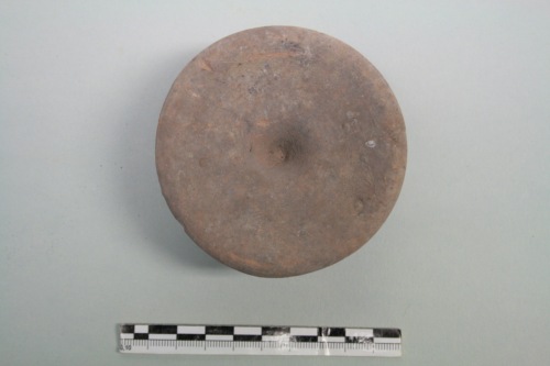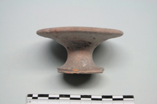 Piattello su piede a vernice nera in argilla rosa-giallo e tracce di vernice bruno scuro. Il piattello è caratterizzato da una piccola cavità al centro della coppa a pareti imbutiformi e un breve stelo su piedo discoide. Probabilmente, per la forma inconsueta ad imbuto, più che di un piccolo piatto potrebbe trattarsi di un supporto per un vaso a fondo rotondo. Forme simili, ma acrome e un pò più allungate,si trovano a Capua e vengono considerati "vasetti votivi".