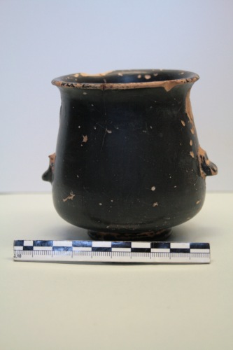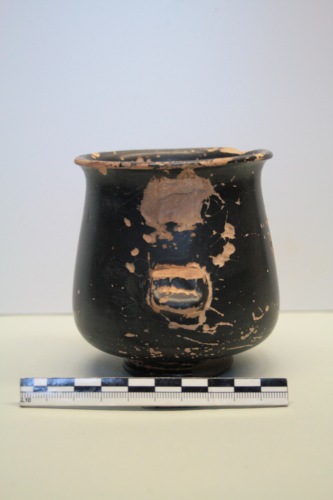 Kantharos-pelikoide a vernice nera di fabbrica etrusca in argilla rosa e vernice nera a riflessi metallici. Il vaso ha un corpo a ventre abbassato e piccolo orlo esoverso; anse verticali a nastro che all'attacco inferiore terminano con un "riccio"; piedino troncoconico cavo con larga base d'appoggio. Il vaso ha subito molti restauri al fondo e alle anse ed è mancante di alcuni frammenti dell'orlo. Su tutta la superficie è stato steso un colore nero opaco. La forma è tipicamente etrusca ed ebbe una vasta diffusione tra la fine del III e il I secolo a.C. La forma arrotondata del ventre abbassato dell'esemplare di Torcello è tipica delle produzioni dei kantharoi-pelikoidi volterrani. Esemplari simili si trovano anche ad Adria tra la fine del III e il II secolo a.C. e danno luogo ad imitazioni locali.