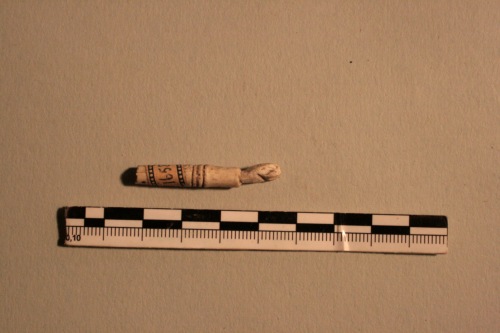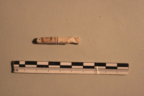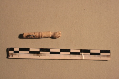 Manico di piccole dimensioni in osso di un oggetto a forma di braccio con decorazione ad incisione circolare e terminante in una mano, che sembra a pugno chiuso.