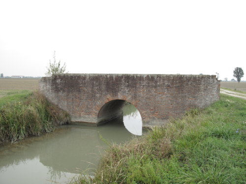 ponte in muratura continua a vista a canna ad arco a tutto sesto con parapetti pieni, pianta rettangolare con passaggio in terra.