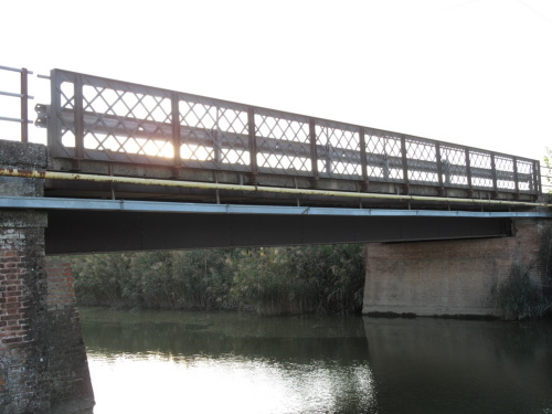 ponte a canna quadra con spalle in muratura continua a vista e trave in ferro, parapetti metallici di diversa tipologia, nella parte centrale riporta un disegno a losanghe.