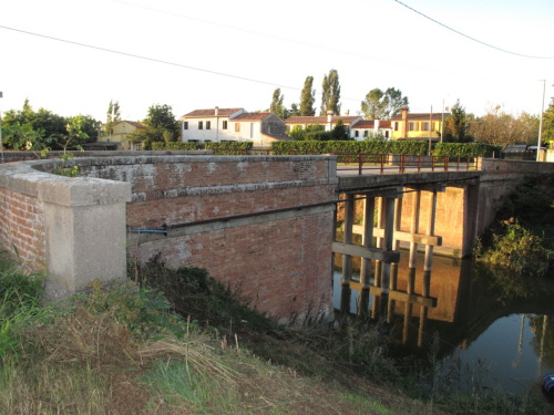 ponte a travata o travatina a canna quadra con spalle in muratura continua e pali e cordoli in cemento armato, parapetti misti in muratura continua a vista e nella parte centrale in ferro "a giorno". Passaggio asfaltato e pianta a doppio C.