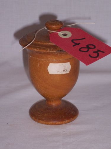coppetta in legno liscia tornita con piede ad anello circolare stretto alla base e largo sul fondo con coperchio circolare con una scanalatura vicino al bordo e con presa circolare.