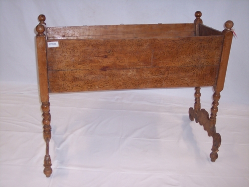 oggetto costituito da un parallelepipedo cavo in legno liscio composto di testiera, traverse e pediera retto da quattro gambe tornite con motivi circolari e poggianti a due a due su due traverse lavorate a linee curve. Le pareti esterne sono decorate con motivi fitomorfi dipinti