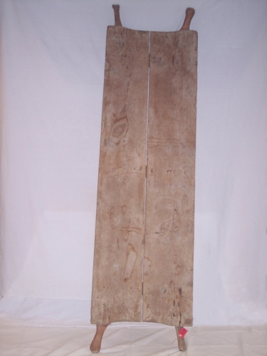 oggetto in legno formato dallunione di due lunghe assi rettangolari in legno inchiodate orizzontalmente a due pezzi di legno trasversali, più corti e più sottili, fungenti da piedi; accanto ai vertici dei lati corti delle assi sono inchiodati due piccoli cilindri in legno con la funzione di manici