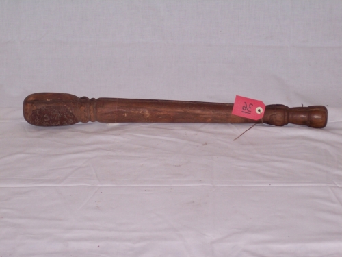 oggetto costituto nella parte superiore da impugnatura cilindrica sagomata ad intaglio, prosegue poi un manico tornito a tronco di cono fino alla parte terminale che si presenta come un cilindro più largo dellimpugnatura con base inferiore convessa. Presenza di incisioni lineari nellimpugnatura e fra il manico e lestremità più larga