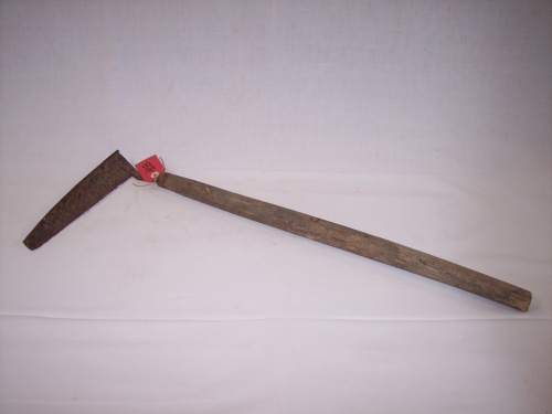 oggetto costituito da una lama rettangolare con una costola rialzata opposta al filo con supporto metallico cavo allinterno per linserimento di un manico in legno di forma cilindrica