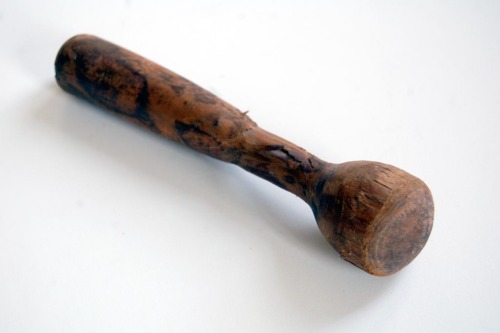 Utensile in legno di forma cilindrica che si restringe nellestremità inferiore per poi allargarsi nella testa battente arrotondata.