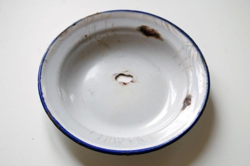 Basso recipiente di forma circolare con bordo piatto e largo leggermente svasato e spigolo arrotondato; il diametro della base è circa la metà del diametro del bordo superiore; in latta smaltata di bianco e bordata di blu.