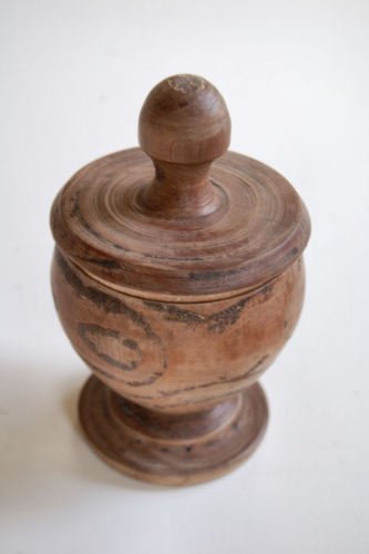recipiente in legno a sezione circolare, poggiante su una base rotonda modanata. Dotato di coperchio circolare con chiusura ad incastro ed impugnatura centrale a pomello
