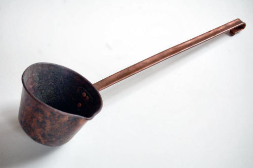 utensile in rame composto da un manico piatto terminante ad uncino con ricciolo ad unestremità, e da un recipiente di forma tronco conica, a fondo concavo con un beccuccio sul bordo superiore arrotondato. Lestremità inferiore del manico è fissata al recipiente tramite tre borchie in rame; interno rinforzato da bandella in rame fissata con quattro borchie.