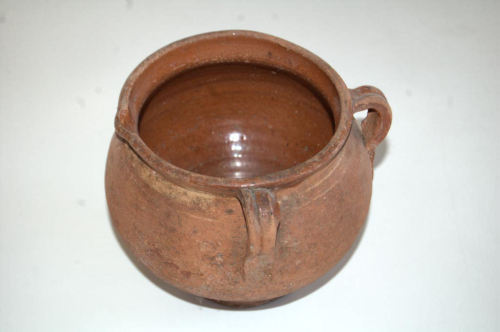 recipiente a sezione circolare, di forma panciuta (simile ad una pigna posta verticalmente con la punta verso il basso); bocca superiore leggermente svasata, con spigolo arrotondato e beccuccio; il diametro della base è circa la metà del diametro della bocca; dotato di due manici ad occhiello posti sotto il bordo superiore alle due estremità di un angolo retto; in terracotta marrone smaltata allinterno