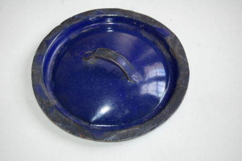 oggetto in ferro di forma circolare a calotta; con bordo rialzato; dotato di manico arcuato, saldato sulla sommità del coperchio stesso. Smaltato interamente di colore blu.