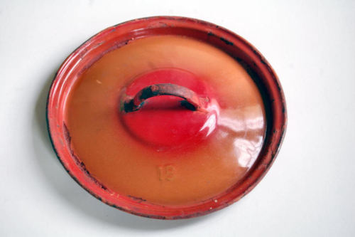 oggetto in ferro di forma circolare leggermente concavo; con bordo rialzato; dotato di manico arcuato, saldato sulla sommità del coperchio stesso. Smaltato di colore arancio allinterno e rosso e arancio sfumati allesterno. Reca il numero 18 in rilievo.