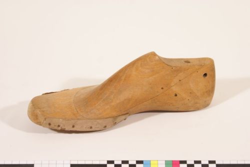 - FUNZIONE E MODALITÀ D'USO modellatura della scarpaservono un paio di forme (una destra ed una sinistra) per ciascun numero di scarpe, ma qui ne è rimasto solo l'esemplare destro; sui bordi sono presenti delle listelle di cartone pressato fissate con chiodini, che permettono di variare l'ampiezza della pianta della scarpa per meglio adattarla al piede: trattasi di spessori rimovibili