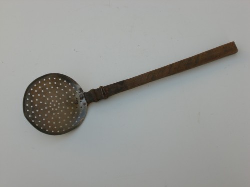 Utensile formato da un manico lungo di legno e un corpo principale a forma piatta e circolare. Il corpo principale del ramaiolo è forato. Il manico è unito al corpo circolare tramite chiodi e fil di ferro.