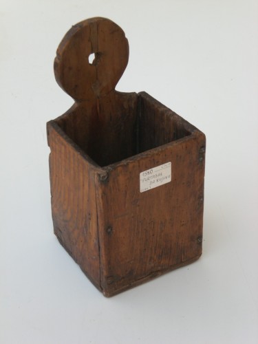 recipiente di forma quadrangolare formato da quattro tavolette in legno, tre delle quali uguali. La quarta, nella parte posteriore, sovrasta le altre ed è sagomata in forma rotonda con al centro un foro per appendere il manufatto. LE quattro pareti sono assemblate con chiodi fatti a mano.