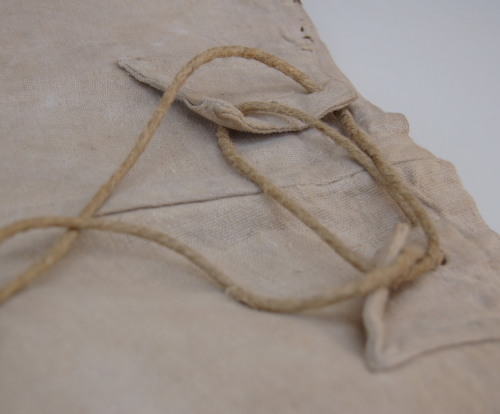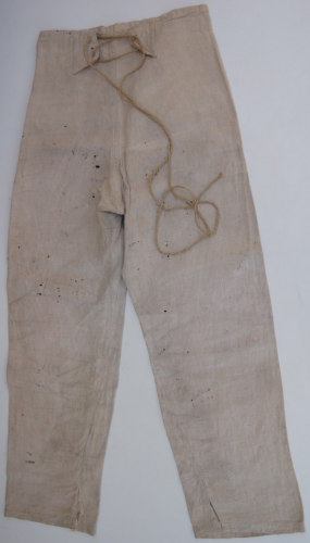 lunghe, di colore chiaro, con un'alta cintura che si chiude sul davanti con due bottoni #botòi# bianchi in plastica, un altro bottone posto più in basso chiude l'apertura frontale #botèga#. Sul retro sono applicati due trapezi della stessa stoffa caratterizzati ognuno da tre fori attraverso i quali passa uno spago #spac# utilizzato per stringerle meglio alla vita. Il risvolto ai margini inferiori #balzone# è sostenuto da una doppia cucitura #cosidùra#