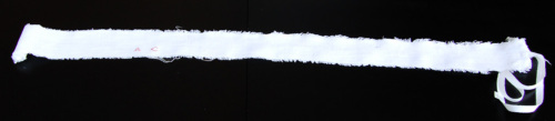 Di cotone bianco sfrangiato. Ad una delle due estremità è cucita una fettuccia di cotone bianco. Circa a metà della fascia sono ricamate con filo di cotone rosso a punto croce le lettere A.C.