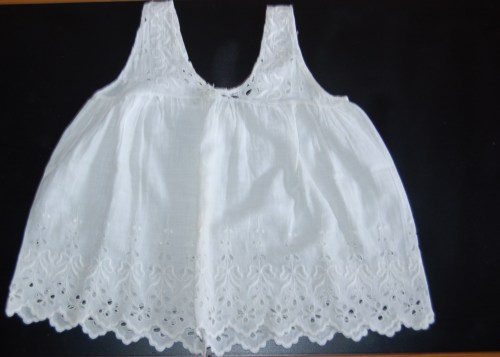 In cotone bianco con ricami floreali e fiocchi. La chiusura (dietro) è formata da un bottone di plastica a pressione. Il carré e le spalline sono ricamate a macchina. Da sotto il carré parte unarricciatura. Lo scollo davanti e dietro è a V. Sul bordo inferiore del vestito è presente un ricamo uguale a quello del carré e un ricamo traforato a fiore. L'abito termina a punto festone.