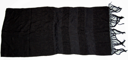 In seta nera con ricamo floreale, tipo damascato. Alle due estremità termina con delle frange annodate in modo da creare un motivo a quadrati.