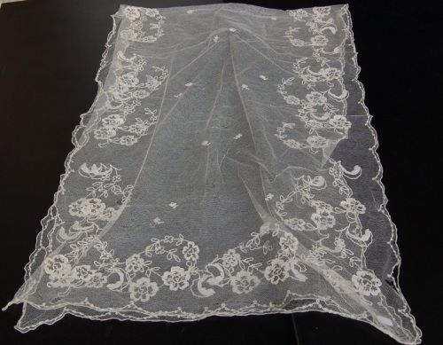 Di forma rettangolare. Formato da una retina di filo di cotone bianco di produzione industriale ricamato con motivi floreali in filo di cotone bianco, ricami eseguiti a macchina. Il decoro floreale è di due tipi: uno segue tutto il perimetro del velo creando una specie di cornice laltro si trova nella parte centrale dove sono ricamati dei piccoli fiorellini sparsi diversi dalla bordura.