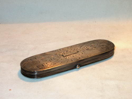 L'astuccio di forma rettangolare è in argento. Sulla parte superiore è presente una serie di incisioni a volute e motivi floreali, sulla parte inferiore la dedica: H.Niemann / Zum Andenken / an Seinen Vielgelibten Pfarrer / Den Hochw Herrn Kirchenrath / H. Bùschelmann / Examinator Prosynodalis / Inhaber des Allgemeinen Ehrenzeichens I Classe/ des Grosshezzogl, Oldenburgischen haus Verdients Ordens. Traduzione: H.Niemann / in ricordo del nostro benamato parroco / l'alto prelato H. Bùschelmann / esaminatore prosinodale / in possesso della decorazione di I classe del granduca / ordine di merito al casato dell'Oldenburgo.