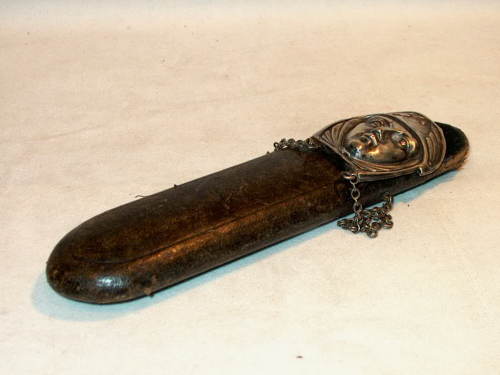 Astuccio a chàtelaine in cuoio con inserimento dell'occhiale dall'alto. Le finiture e il gancio sono in argento. Il gancio, attaccato all'astuccio tramite due catenelle, serviva per il fissaggio alla cintura.