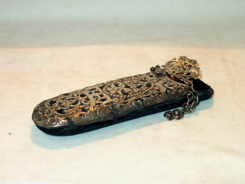 Astuccio a chàtelaine in argento. Sia il fermaglio che il corpo sono traforati e incisi.