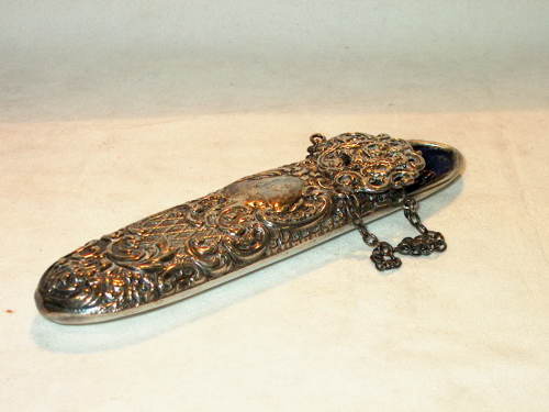Astuccio a chàtelaine in argento sbalzato a motivi in stile Luigi XV. Anche il gancio è in argento. Punzoni d'argento: Birmingham 1899.