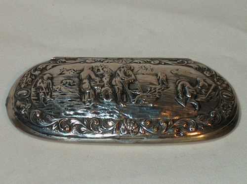 Astuccio di forma quasi ovale, in metallo lucido. Sulla faccia superiore, un rilievo con scena di lavori costituita da otto personaggi. Un fregio contorna la scena. L'interno è rivestito con velluto blu.