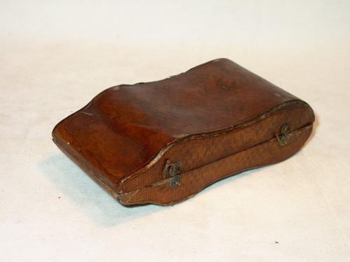 Lastuccio in legno ricoperto di pelle color marrone segue la sagoma del binocolo. Allinterno foderatura con seta di colore viola. Allesterno due gancetti sul fianco.