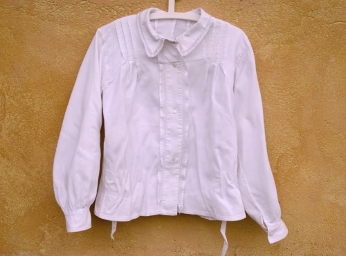 camicia in cotone piquet rigato bianco con piccolo colletto a punta bordato da un basso (1.5 cm) pizzo all'uncinetto. L'abbottonatura femminile a vista è davanti. I quattro piccoli bottoni sono di madreperla. Sul davanti dalle spalle scendono per 13 cm tre pieghette con conseguenti pinces. Sul dietro ci sono tre pinces all'altezza del collo. I polsini sono foderati con lino bianco e sono chiusi da un bottoncino. All'interno all'altezza della vita sono cucite due fettucce, che, una volta allacciate, fanno aderire la camicia al corpo.
